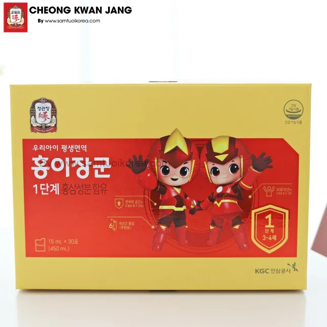 Nước hồng sâm trẻ em đặc chế với hồng sâm Hàn Quốc, bạch chỉ Hàn Quốc, nhung hươu và Vitamin C để tăng cường hệ thống miễn dịch, sức đề kháng của trẻ nhỏ, cũng như hỗ trợ sự phát triển khỏe mạnh và phát triển trí não. Thêm vào đó, nó được làm ngọt nhẹ với chiết xuất từ lê, táo tàu và cà rốt tím để trẻ sử dụng một cách dễ dàng.